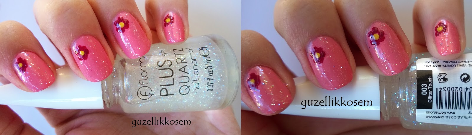 Daha sonra da çiçeklere denk gelmeyecek şekilde Flormar Plus Quartz 003 Glitter Touch isimli simli ojeyle hareket kattım desenimize.